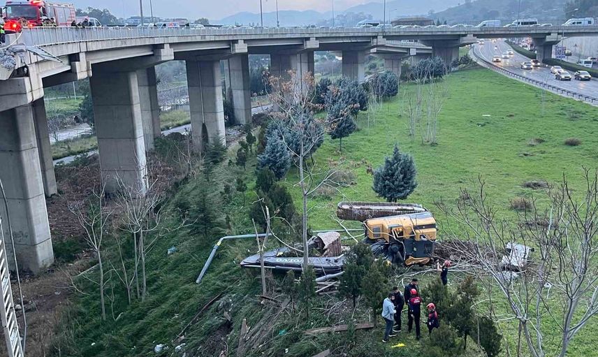 İzmir'in Buca ilçesinde freni boşalan iş makinesi yüklü kamyonun çarpması sonucu 3 kişi yaralandı; iş makinesi köprüden metrelerce yükseklikten düştü.