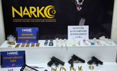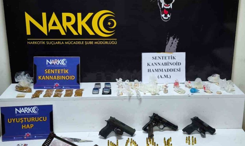 İsmetpaşa Mahallesi'ndeki evde yapılan aramada 13 kilo 300 gram bonzai elde edilebilen 133 gram bonzai ham maddesi, 94 gram bonzai, 8 adet sentetik ecza, 4 adet hassas terazi, biri otomatik olmak üzere 4 adet ruhsatsız tabanca ve 53 adet mermi ele geçirildi.