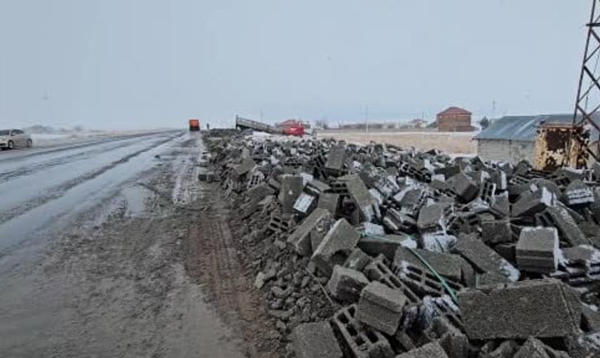 Bitlis'in Adilcevaz ilçesinde, briket yüklü bir tırın devrilmesi sonucu 1 kişi yaralandı ve yükteki briketler etrafa saçıldı.