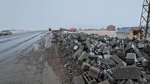 Bitlis'in Adilcevaz ilçesinde buzlanma nedeniyle 61 AGY 645 plakalı briket yüklü tır devrildi; sürücü yaralandı, briketler yola saçıldı.