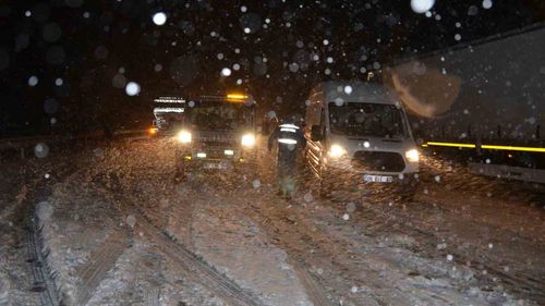 Bin 825 rakımlı Alacabel'de sıcaklığın 5 dereceye düşmesiyle dün saat 23.00'te kar başladı; Karayolları ekipleri 10 km'lik alanda küreme ve tuzlama çalışıyor.
