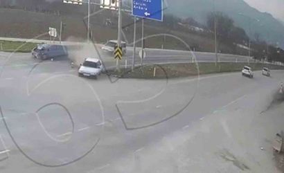 Çarpmanın etkisiyle savrulan otomobil sinyalizasyon direğine çarparak durabildi. Kaza anı güvenlik kamerasına yansıdı.