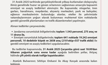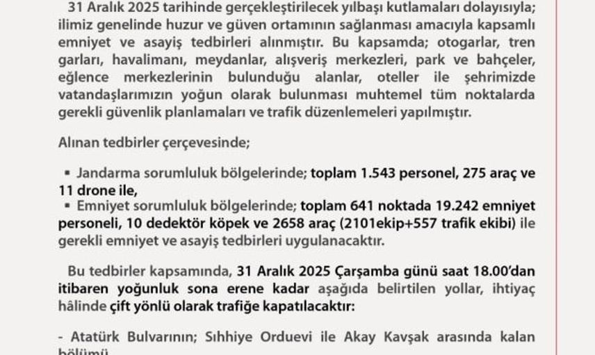 Açıklamada, tedbirler kapsamında 31 Aralık 2025 Çarşamba günü saat 18.00’dan itibaren yoğunluğun sona ermesine kadar ihtiyaç halinde bazı yolların çift yönlü olarak trafiğe kapatılacağı duyuruldu. Kapatılabileceği belirtilen yollar şunlardır: Atatürk Bulvarının; Sıhhiye Orduevi ile Akay Kavşak arasında kalan bölümü, Milli Müdafaa Caddesinin tamamı, Aşkabat Caddesinin (Bahçeli 7.Cadde) tamamı, Bestekar Caddesinin tamamı, Kızılırmak Caddesinin tamamı, Olgunlar Caddesinin tamamı, Selanik Caddesinin tamamı, Tunalı Hilmi Caddesinin tamamı, Azerbaycan Caddesinin (Bahçeli 3.Cadde) tamamı, Yüksel Caddesinin tamamı, Sakarya Caddesinin tamamı, Kumrular Caddesinin tamamı, Tunus Caddesinin tamamı, Tuna Caddesinin tamamı, Ziya Gökalp Caddesinin; Kolej Kavşak ile Kızılay Kavşak arasında kalan bölümü, İnkılap Sokağın tamamı, Konur Sokağın tamamı, Karanfil Sokağın tamamı, Bilge Sokağın tamamı, Bülten Sokağın tamamı, Çığır Sokağın tamamı, Bayındır Sokağın tamamı, ihtiyaç olması halinde; Oğuzhan Asiltürk Caddesinin tamamı, Meşrutiyet Caddesinin tamamı, Filistin Caddesinin tamamı, Polonya Caddesinin tamamı, İran Caddesinin tamamı, Arjantin Caddesinin tamamı, Kuleli Caddesinin tamamı.