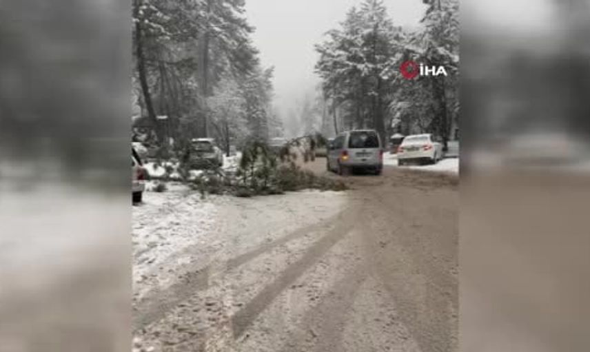 Yoğun kar birikintisi nedeniyle kökünden yola devrilen çam ağacı, trafikte aksamaya yol açtı. Olayda can kaybı ya da yaralanma yaşanmadı.