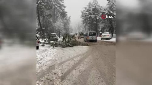Kızılcahamam Soğuksu Milli Parkında karın ağırlığını taşıyamayan çam ağacı devrildi; ekipler müdahale ederek yolu açtı.