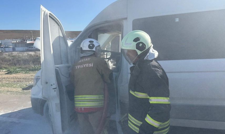 Hatay'ın Antakya ilçesi Narlıca Mahallesi mevkiinde seyir halindeki bir minibüsün motor kısmından alevler yükseldi.