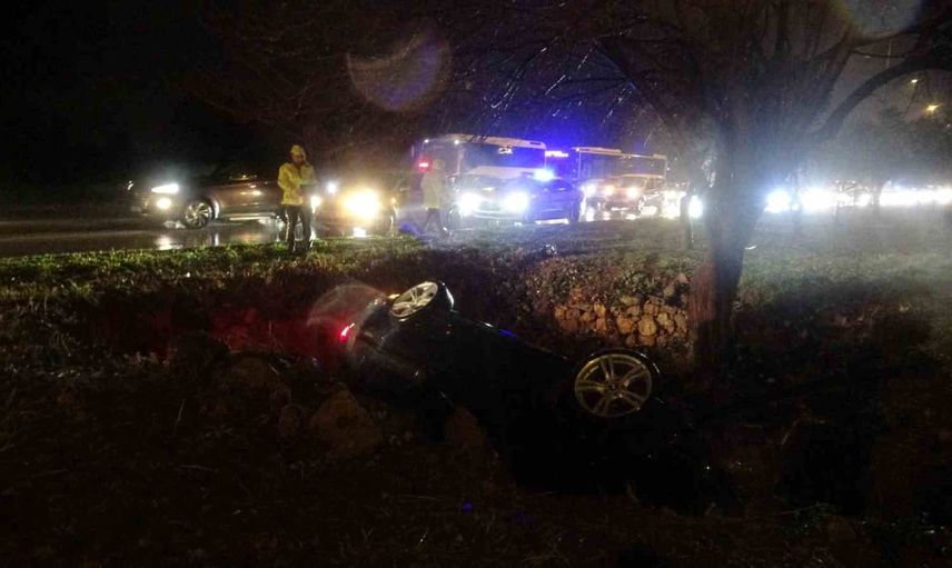 Antalya'nın Kepez ilçesinde, saat 20.00 sıralarında meydana gelen kazada, yağmur nedeniyle kayganlaşan yolda kontrolden çıkan lüks otomobil refüjdeki çukura düştü.