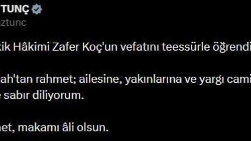 Adalet Bakanı Yılmaz Tunç, Yargıtay Tetkik Hakimi Zafer Koç'un vefatı nedeniyle ailesine ve yargı camiasına başsağlığı diledi.