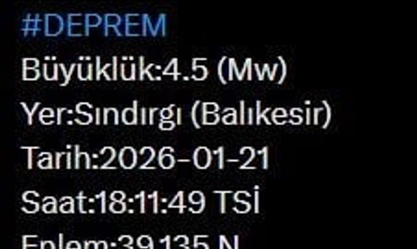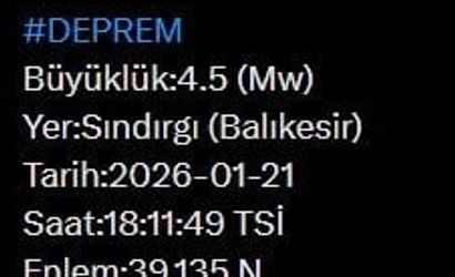 AFAD'dan alınan bilgiye göre, merkez üssü Balıkesir'in Sındırgı ilçesi olan saat 18.11'de 4.5 büyüklüğünde deprem meydana geldi.