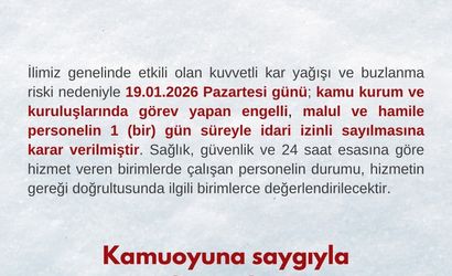 Bartın Valiliği'nden yapılan yazılı açıklamada, 'İlimiz genelinde etkili olan kuvvetli kar yağışı ve buzlanma riski nedeniyle 19.01.2026 Pazartesi günü; kamu kurum ve kuruluşlarında görev yapan engelli, malul ve hamile personelin 1 gün süreyle idari izinli sayılmasına karar verilmiştir.' denildi.