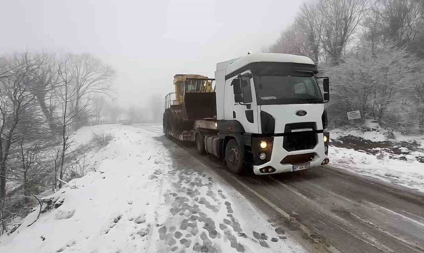 Zonguldak'tan Bartın'daki Çöp Depolama ve Geri Dönüşüm Tesisi'ne iş makinesi taşıyan bir tır, yoğun kar yağışı ve buzlanma nedeniyle Kazpınarı köyü mevkiinde kayarak Bartın-Amasra eski kara yolunu ulaşıma kapattı.