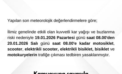 Valiliğin açıklamasında şu ifadelere yer verildi: ’Yapılan son meteorolojik değerlendirmelere göre, ilimiz genelinde etkili olan kuvvetli kar yağışı ve buzlanma riski nedeniyle 19.01.2026 Pazartesi günü saat 08.00’den 20.01.2026 Salı günü saat 08.00’e kadar motosiklet, scooter, elektrikli scooter, elektrikli bisiklet, bisiklet ve motokuryelerin trafiğe çıkması tedbiren yasaklanmıştır. Kamuoyuna saygıyla duyurulur’’ ifadeleri kullanıldı.