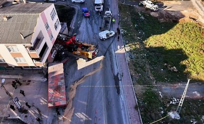BAŞAKŞEHİR’DE Ş MAKİNESİNİN ÇEKTİĞİ TIRIN ARKASINDA TAŞINAN BİR VİNÇ DÜŞEREK 2 ARACA VE BİR BİNAYA ÇARPTI. BİNA TAHLİYE EDİLİRKEN, KAZA ANI SANİYE SANİYE GÜVENLİK KAMERASINA YANSIDI. BİNA VE OLAY YERİ HAVADAN GÖRÜNTÜLENDİ.