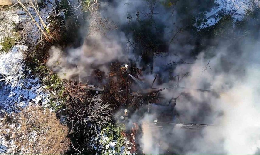 Zorlu hava ve yol şartlarına rağmen itfaiye ekiplerinin yoğun çalışması sonucu alevler kontrol altına alındı.