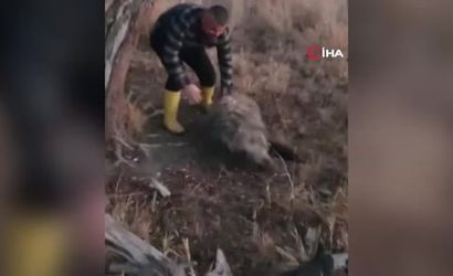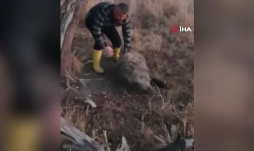 Konya’nın Beyşehir ilçesinde bir vatandaş mallarına zarar veren yaban domuzunu elleriyle yakaladı.