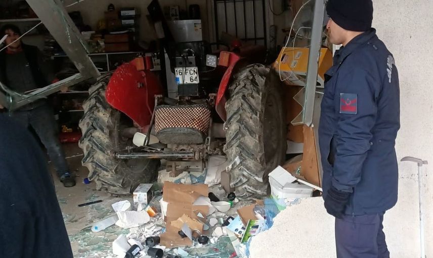 Kazada, iddialara göre aracın sürücüsü M.G.'nin direksiyon başında tansiyonu düştü. Kontrolden çıkan traktör, 16 FCN 64 plakalı araçla iş yerinin ön camından içeri girdi.