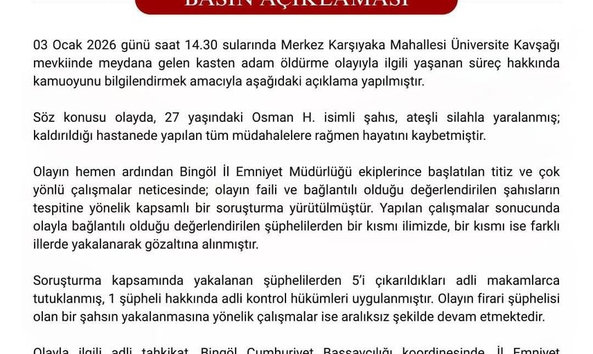 BİNGÖL’DE BİR KİŞİNİN HAYATINI KAYBETTİĞİ CİNAYET OLAYINDA POLİS EKİPLERİ TARAFINDAN YAPILAN ÇALIŞMADA, 6 ŞÜPHELİ GÖZALTINA ALINDI. ADLİYEYE SEVK EDİLEN ŞÜPHELİLERDEN 5’İ TUTUKLANIRKEN 1’İNE ADLİ KONTROL KARARI VERİLDİ