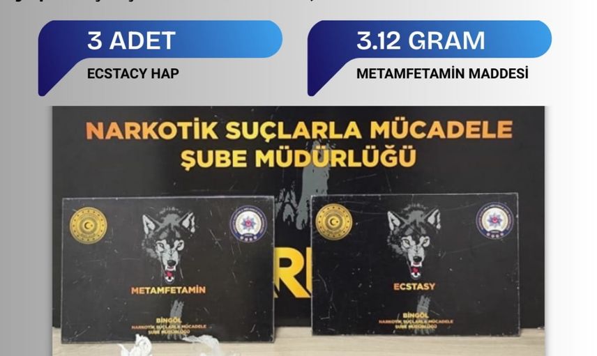 Bingöl Emniyet Müdürlüğü Narkotik Suçlarla Mücadele Şube Müdürlüğü ekiplerinin yürüttüğü çalışmalarda, 3 adet ecstasy hap ile 3,12 gram metamfetamin maddesi ele geçirildi.