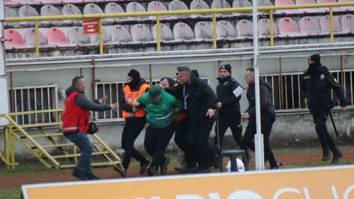 Trendyol 1. Lig 23. haftasında, 85. dakikada tribünden atlayan 2 Sakaryaspor taraftarı Boluspor tribününe koştu; polis kelepçeleyip gözaltına aldı.