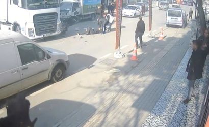 BURSA'DA ANAYOLDA SEYİR HALİNDEKİ MOTOKURYE, ARA YOLDAN ÇIKAN TIRA ÇARPIP SAVRULDU. KAZA ANI KAMERAYA YANSIRKEN, YARALI HASTANEYE SEVK EDİLDİ.
