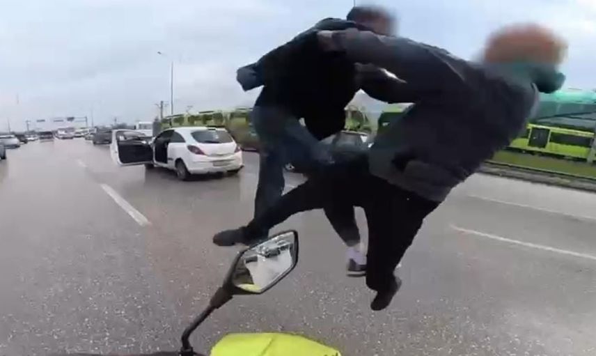 Bursa-İzmir yolu üzerinde iki sürücü arasında başlayan 'yol verme' tartışması, kısa sürede fiziksel kavgaya dönüştü. Olayda taraflar araçlarından inerek birbirlerine uçan tekme ile saldırdı.