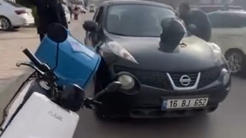 Bursa Nilüfer'de otomobil sürücüsü ile motosikletli kurye arasında 'yol verme' tartışması güvenlik kamerasına yansıdı.
