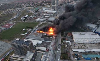 Söndürme çalışmaları devam ederken, alev alev yanan fabrika ve müdahale görüntüleri dronla havadan kaydedildi.