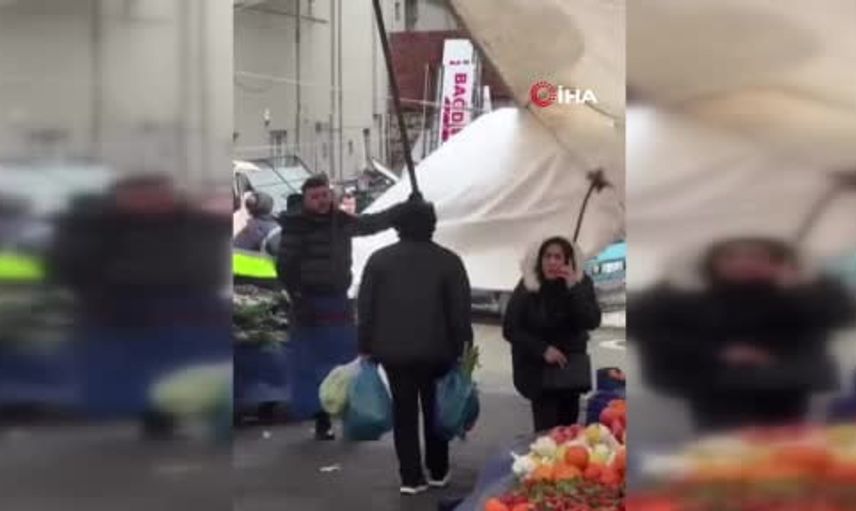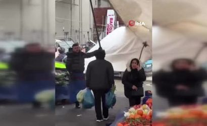 Fırtına nedeniyle pazarın brandaları havalanırken, müşteriler ve pazarcılar panik yaşadı. Havalanan branda demirlerini tutmaya çalışan pazarcıların mücadelesi cep telefonu kamerasına yansıdı.