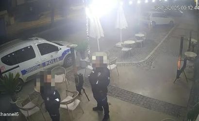 Görüntülerde; siyah otomobilin polis aracına çarpması, araçların savrularak kafeteryanın masa ve sandalyelerini uçurması ve kaldırımda bulunan iki polis memurunun şans eseri kurtulması yer aldı.