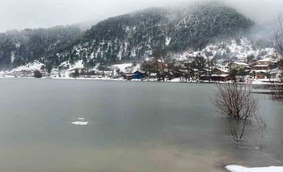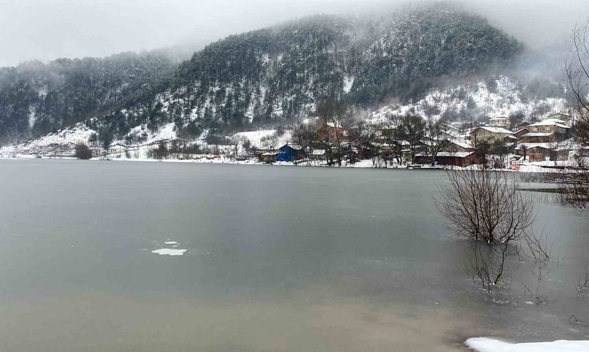 Buzla örtünen göl, etrafını saran beyaz örtü ile birleşerek seyrine doyumsuz manzaralar ortaya çıkardı. Bölgedeki doğal görüntüler, kışın huzur veren yüzünü bir kez daha gösterdi.