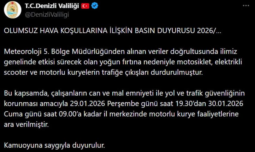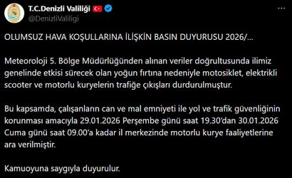 Denizli Valiliği, Meteoroloji verileri doğrultusunda etkisini sürdürecek olan yoğun fırtına nedeniyle il merkezinde motorlu kurye faaliyetlerinin durdurulduğunu açıkladı.