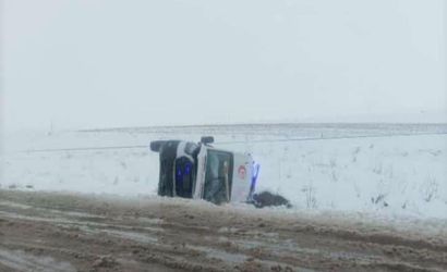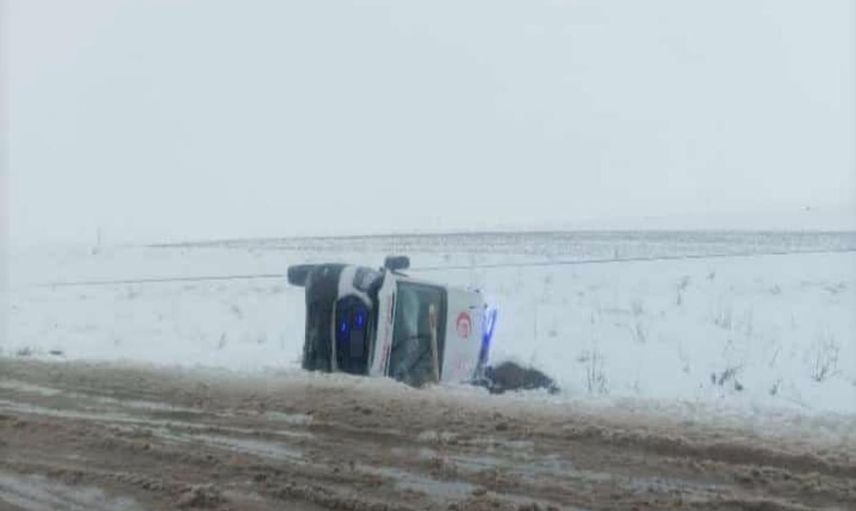 Diyarbakır’ın Bismil ilçesinde zorlu kış şartlarında görev yapan sağlık ekibini taşıyan ambulans, Bismil-Batman kara yolu Çöltepe mevkiinde yolun kayganlaşması sonucu kontrolden çıkarak devrildi.