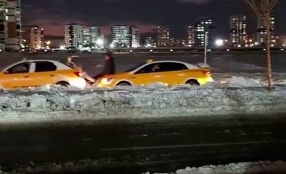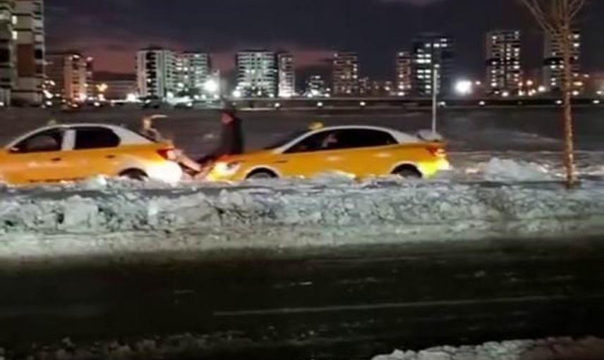 Görüntülerde, başka bir taksinin kaputuna çıkan bir vatandaşın ayaklarıyla öndeki aracın ilerlemesine destek verdiği görülüyor. Aynı zamanda, yolda kalan aracın bagajında bulunan bir kişi de öndeki araçtan destek aldı.