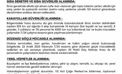 Valilik açıklamasında, alınan tüm tedbirlerin vatandaşların huzur ve güven içinde yeni bir yıla girmeleri için planlandığı belirtilerek, ilgili birimlerin yılbaşı sürecine ilişkin gerekli tüm tedbirleri geniş kapsamlı şekilde aldığı ifade edildi. Tedbirler 30 Aralık 2025 - 2 Ocak 2026 tarihleri arasında kesintisiz uygulanacaktır.