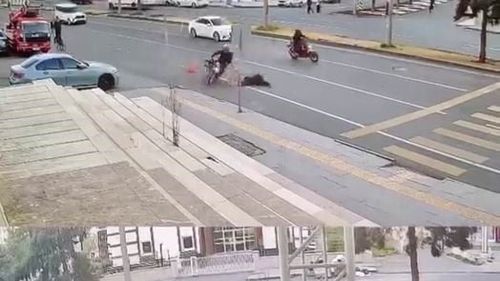 Bağlar ilçesi Mevlana Halit Caddesi'nde yolun karşısına geçmek isteyen kadına motosiklet çarptı; yaya ve sürücü yaralandı, kaza anları güvenlik kamerasında.