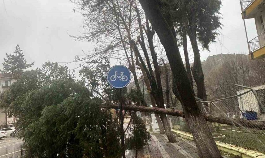 Balıkesir'in Dursunbey ilçesinde öğle saatlerinde etkili olan fırtına, ilçe genelinde ağaçları ve çatıları uçurdu. Devrilen ağaçlar ve uçan çatı parçaları özellikle cadde ve sokaklarda hasara yol açtı.