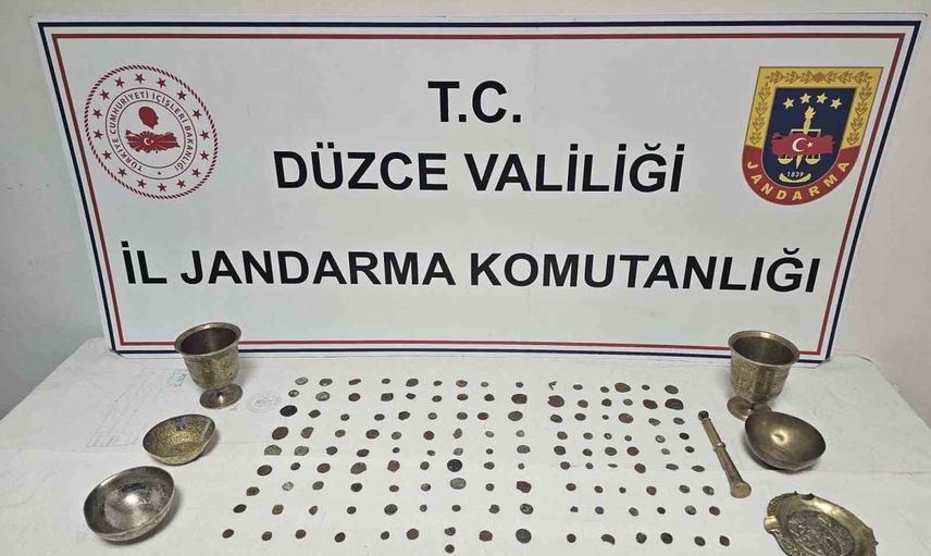 DÜZCE (İHA) – Düzce İl Jandarma Komutanlığı Kaçakçılık ve Organize Suçlarla Mücadele (KOM) ekiplerinin yürüttüğü çalışmada, Gümüşova ilçesinde tarihi eser kaçakçılığına yönelik bir operasyon düzenlendi.