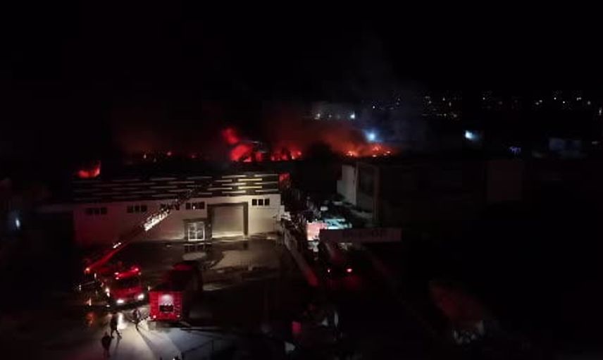 Yangının sürdüğü fabrika, geceyi aydınlatan alevlerin büyüklüğüyle dron kamerasına yansıtıldı. Havadan çekilen görüntülerde yangının boyutu ve söndürme çalışmalarının yoğunluğu açıkça görülüyor.