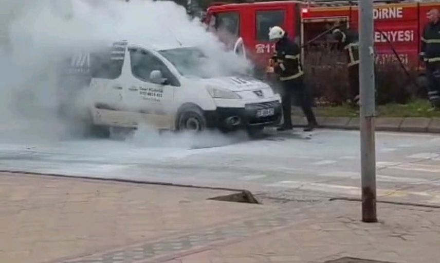 Edirne merkez Zübeyde Hanım Caddesi Trakya Birlik kavşağı'nda sabah saatlerinde seyir halindeki bir otomobilin motor kısmında yangın çıktı. Kısa sürede yükselen alevler ve yoğun duman, çevrede paniğe neden oldu.