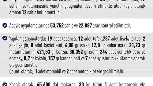 Elazığ'da haftalık asayiş bilançosu açıklandı Elazığ Valiliği, 18-25 Ocak 2026 tarihlerini kapsayan haftalık asayiş bültenini yayımladı. Buna göre kent genelinde meydana gelen 209 olayta 265 şahıs yakalandı ve 48 şahıs tutuklandı. Yürütülen denetim ve kontrollerde toplam 53.752 şahıs ve 22.887…