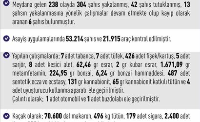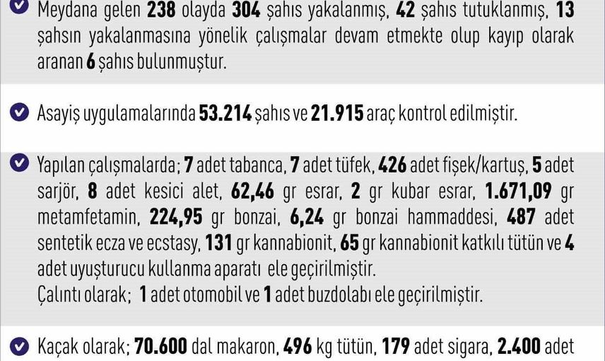 Yapılan operasyonlarda 7 adet tabanca, 7 adet tüfek, 426 adet fişek/kartuş, 5 adet şarjör, 8 adet kesici alet, 62,46 gram esrar, 2 gram kubar esrar, 1.671,09 gram metamfetamin, 224,95 gram bonzai, 6,24 gram bonzai hammaddesi, 487 adet sentetik ecza ve ecstasy, 131 gram kannabionit, 65 gram kannabionit katkılı tütün ve 4 adet uyuşturucu kullanma aparatı ele geçirildi.