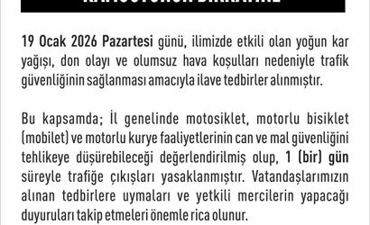 "19 Ocak 2026 Pazartesi günü, ilimizde etkili olan yoğun kar yağışı, don olayı ve olumsuz hava koşulları nedeniyle trafik güvenliğinin sağlanması amacıyla ilave tedbirler alınmıştır. Bu kapsamda; İl genelinde motosiklet, motorlu bisiklet (mobilet) ve motorlu kurye faaliyetlerinin can ve mal güvenliğini tehlikeye düşürebileceği değerlendirilmiş olup, 1 (bir) gün süreyle trafiğe çıkışları yasaklanmıştır. Vatandaşlarımızın alınan tedbirlere uymaları ve yetkili mercilerin yapacağı duyuruları takip etmeleri önemle rica olunur" denildi.