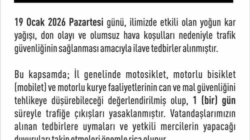 Elazığ Valiliği, yoğun kar ve don nedeniyle 19 Ocak 2026 Pazartesi günü motosiklet, mobilet ve motorlu kuryelerin 1 gün trafiğe çıkışını yasakladı.