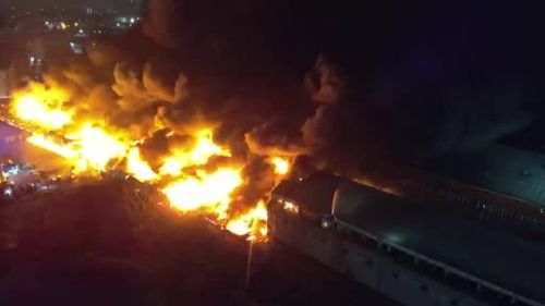 Esenyurt Osmangazi Hadımköy Yolu'ndaki hırdavat fabrikasında çıkan yangın 8. saati geride bırakırken, itfaiye 5 koldan müdahale ediyor; patlamalar tüplerden kaynaklandı.
