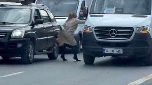 İstanbul Esenyurt'ta trafikte çıkan sözlü tartışma, kadın sürücünün aracından inip servis aracındaki kişilere topuklu ayakkabısıyla saldırmasıyla büyüdü; olay cep telefonu kamerasına yansıdı.