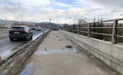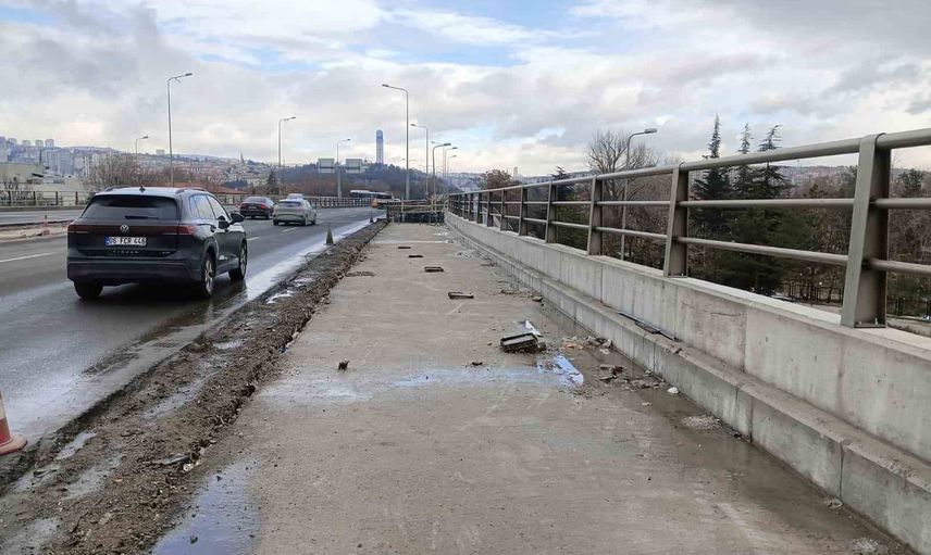 Köprünün yanlarında düzenlenen çalışma sonrası açık bırakılan bölümlerden dökülen molozlar, aşağıdan geçen Turgut Özel 2 Bulvarı'nda seyir hâlindeki araçlar için risk oluşturuyor.