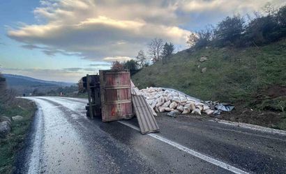 Seyir halindeki 16 SR plakalı yem yüklü kamyon, sürücüsünün direksiyon hakimiyetini kaybetmesi sonucu devrildi. Kazada yaralanan olmadı ancak araçta maddi hasar oluştu.