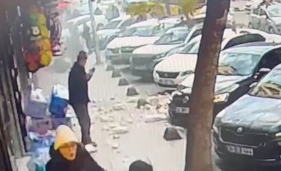 İddiaya göre, cadde üzerindeki 5 katlı binanın en üst kat dairesine ait balkonda çökme yaşandı. O sırada kaldırımda yürüyen yayalar, düşen parçaların altında kalmaktan son anda kurtuldu. O anlar güvenlik kamerasına anbean yansıdı.