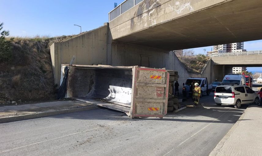 Hatay’da sürücüsünün kontrolünü kaybetmesiyle hafriyat kamyonu devrildi. Kaza, Arsuz ilçesi Nardüzü Mahallesi sınırlarında gerçekleşti ve araç sürücüsü yaralandı.