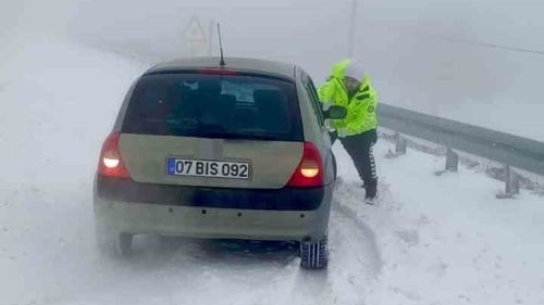 Hatay’ta etkili kar yağışı sonrası yollarda mahsur kalan vatandaşlara polis ekipleri kürekle ve iterek müdahale ederek yardım etti; bazı yollar kar lastiği olmayan araçlara kapatıldı.